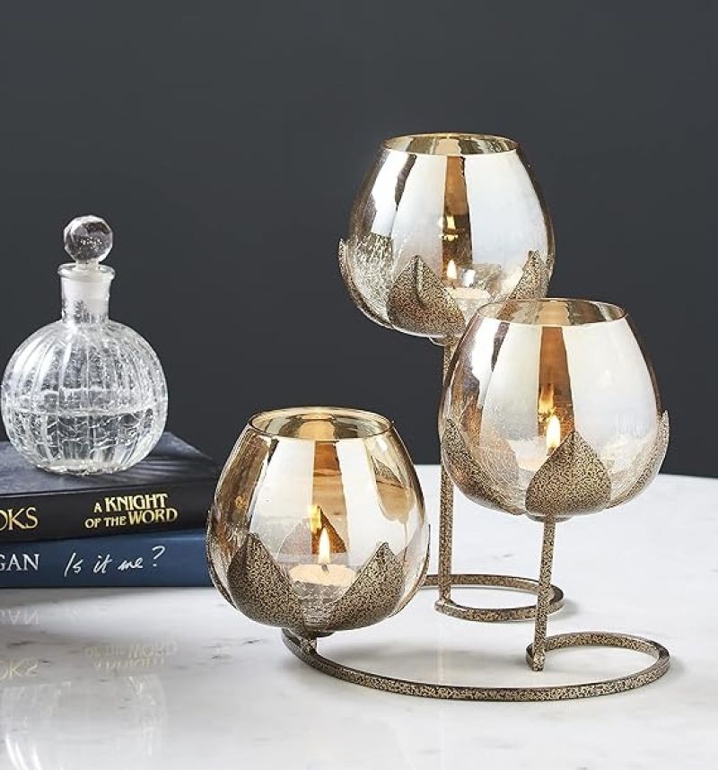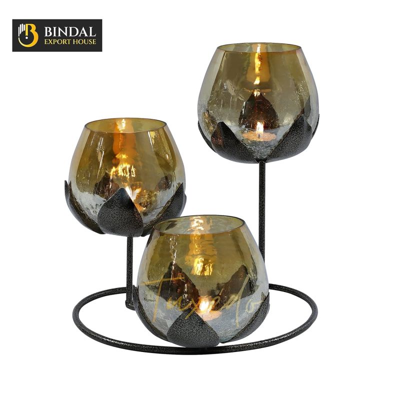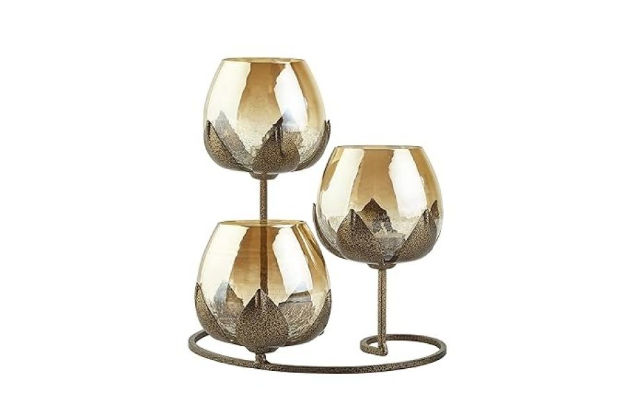 Spectacularly intricate and elegantly unique, this candle holder features 3 Glass cups perched on sleek scrolling bars of glossy metal.