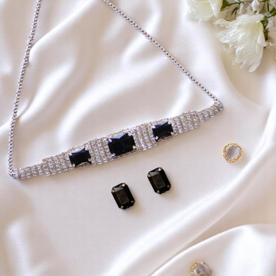 ACCESSHER Silver-Toned Multilayer American Diamond Choker Necklace Set with Stones, Jewellery Set for Women, AD Studded Combo Necklace & Earrings Set
