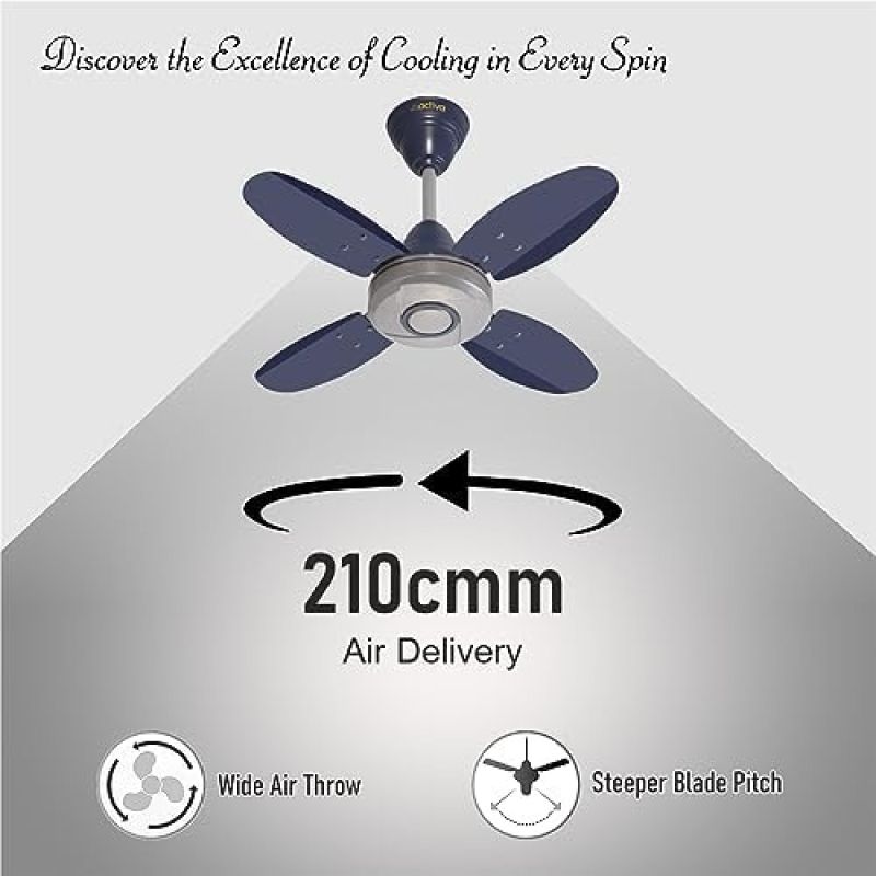 ACTIVA ORNET 600mm Ceiling Fan, 850 RPM High Speed Air Delivery with 4 Blades, Anti-Dust Coating, 2 Years Warranty - Silver Blue
