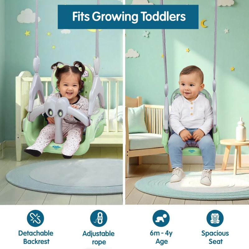 Double Safety Protection — Secure front T-bar plus an integrated safety belt with a secure buckle keep your little one firmly in place during swinging. Extra rope fixers at the back add stability and help prevent tipping.