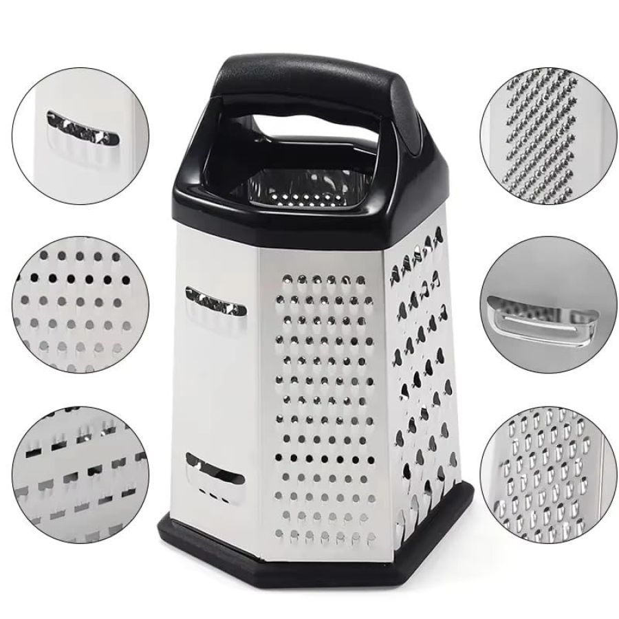 All-purpose grater featuring 6 essential functions for everyday grating, slicing, shredding and zesting. Perfect for Grating Cheese, Carrot, Vegetables, Parmesan, Nutmeg, Ginger, Garlic, Chocolate, Coconut, it also doubles as a lemon zester and handy vegetable