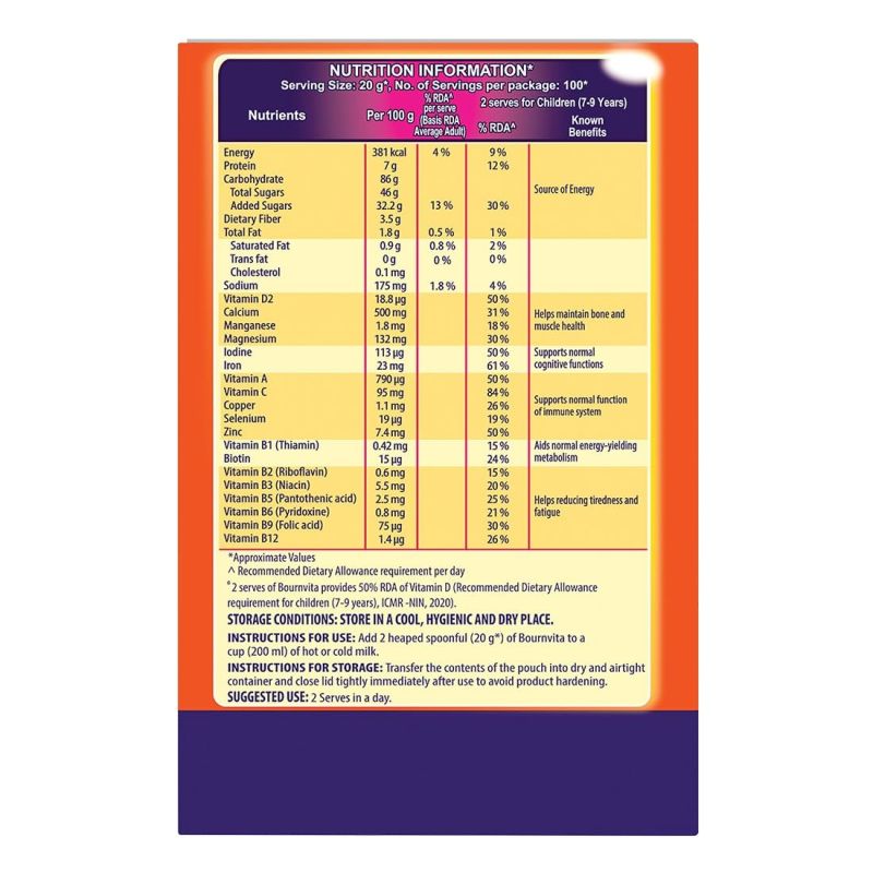 50% of Daily Vitamin Do o2 serves of Bournvita provides 50% RDA of Vitamin D (Recommended Dietary Allowance requirement for children (7-9 years), ICMR -NIN, 2020)