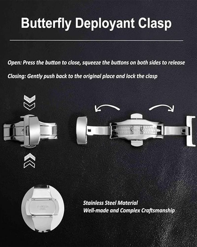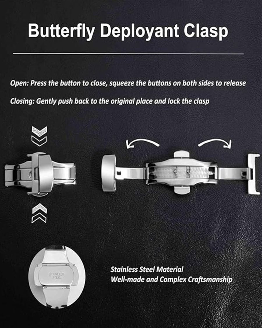 User-Friendly Installation: The butterfly clasp watch strap is designed for quick and hassle-free attachment; Simply align the clasp with your watch band and press the buttons to secure in place