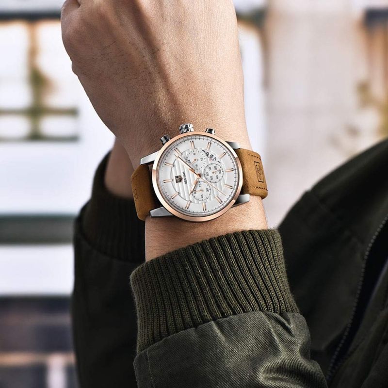 QUALITY LEATHER BAND: Scratch Proof Mineral Glass, Genuine Leather band bring comfortable and gentleman wearing experience.; PRECISE TIME KEEPING: Quartz Movement, provide precise and accurate time keeping.