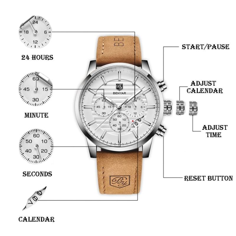 FULL FUNCTIONAL CHRONOGRAPH AND WATERPROOF: Three Chronograph Sub-dial, Seconds sub-dial, Minute Sub-dial, 24 hour Sub-dial. Waterproof (30 M) - 3ATM. Perfect for all kind of business, casual, indoor and outdoor activities and daily use?but not suitable for swimming, bathing and sauna.