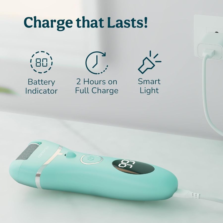 CORDLESS & GREAT BATTERY LIFE: This foot cleaner device includes a helpful LCD display that shows the remaining battery charge. After just 3-4 hours of charging, you’ll get up to 2 hours of use, making it perfect for multiple treatments before needing a recharge. Skip the salon as Bloom Callus Remover is the one of the perfect pedicure tools for a quick and easy way to keep your feet looking their best.