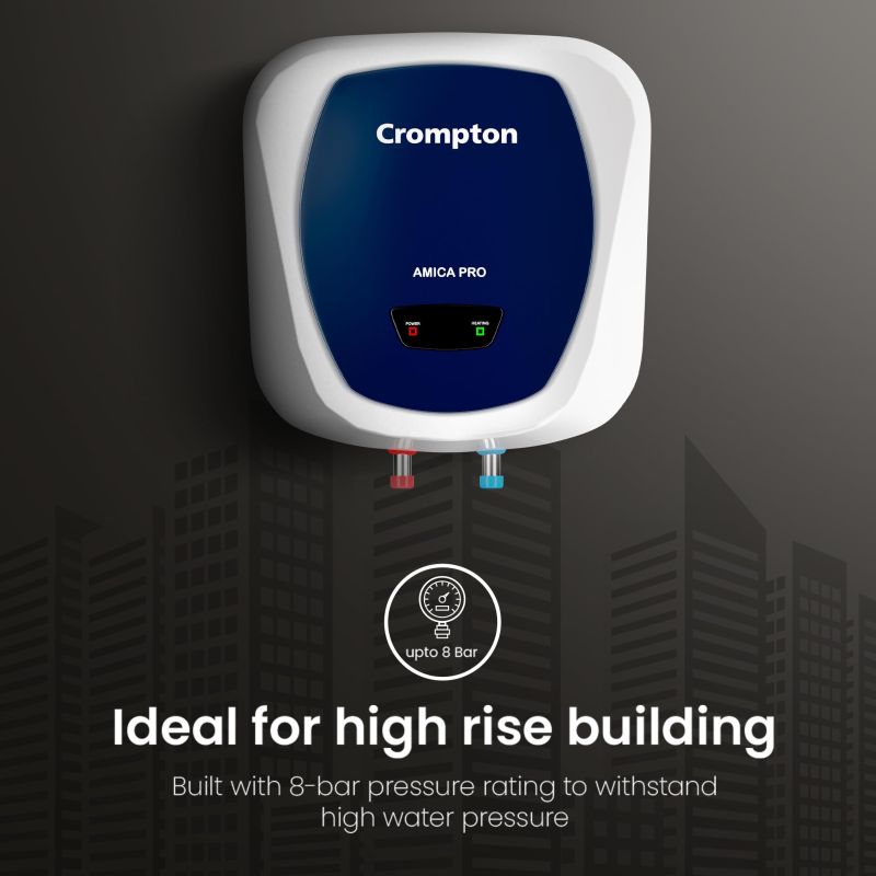 Withstand upto 8 Bar Pressure: With the use of a multi-function valve and a single weld tank, the Amica Pro can withstand upto 8 bar pressures making it suitable for high-rise buildings