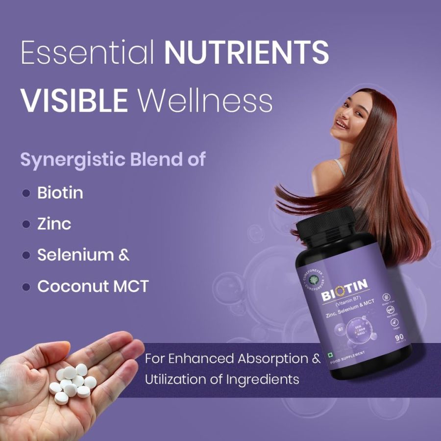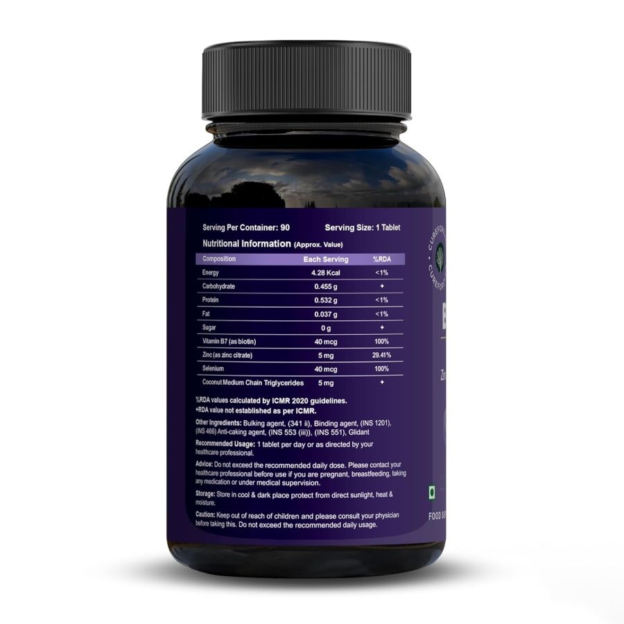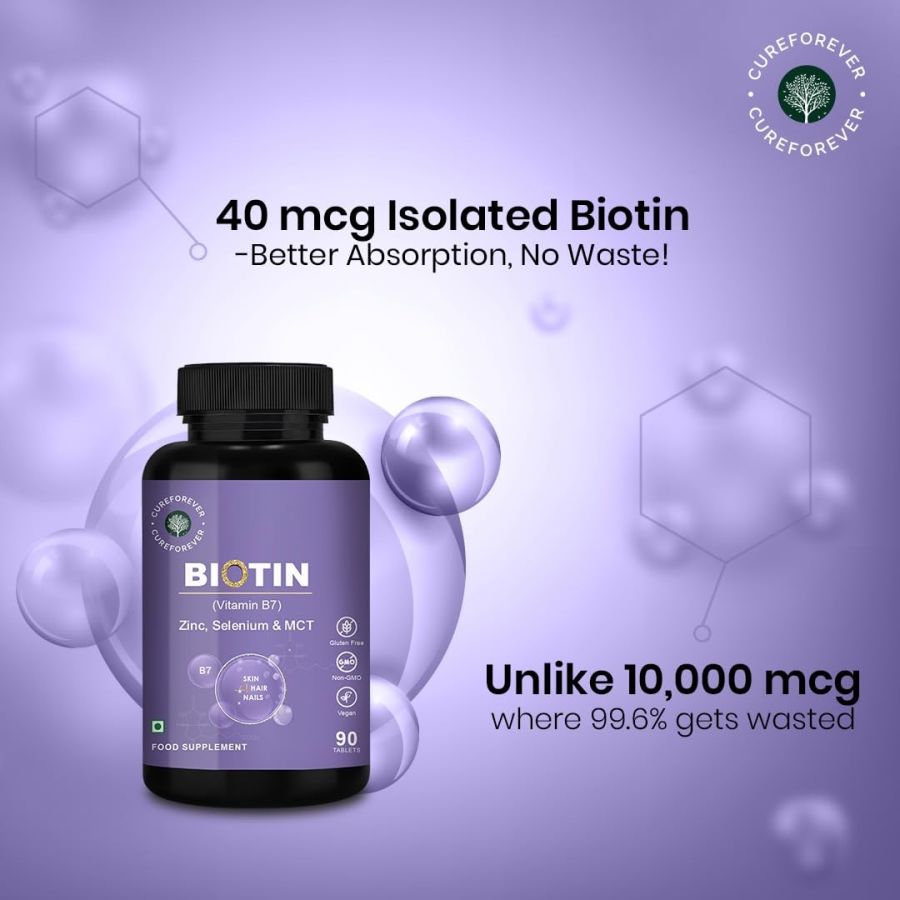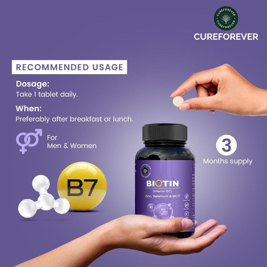 Advanced Biotin Blend for Holistic Nourishment - CureForever Biotin Tablets for Hair Growth offer a unique formulation that combines biotin, zinc, selenium, & coconut MCT to complement your daily routine. Our supplement ensures a high-quality experience, support overall well-being.