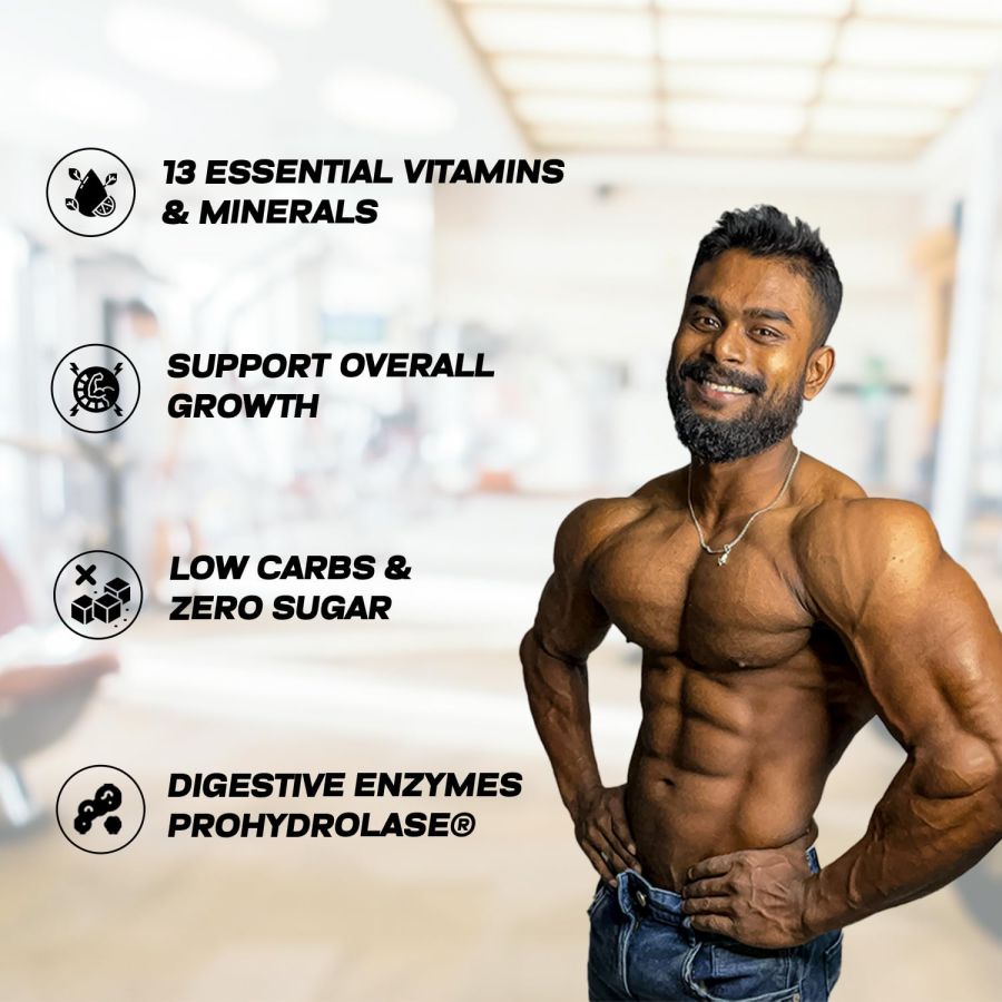 DIVINE NUTRITION BIGGER-FASTER-STRONGER Made with 100% Instant Whey Protein Isolate with 27g Protein with Low Carb & Zero Sugar content, No Added Sugar, extremely low carb (0.3g) & fat (0.13g) content to make this into a low calorie, lactose free & high protein supplement. 13 Essential Vitamins & Minerals to Promote Overall Growth & Immunity.