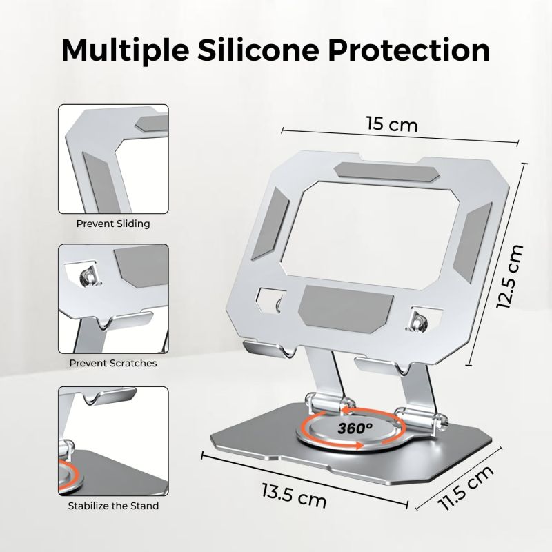 360° Rotating Base: The Dyazo Tablet Stand features a 360° rotating base, allowing you to effortlessly switch between portrait and landscape orientations. This flexibility enhances your viewing experience for videos, presentations, and more.