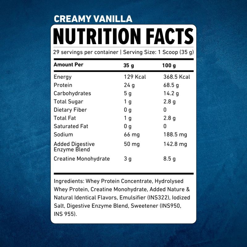 24g of high-quality whey protein per serving for optimal muscle recovery, growth, and repair. Perfect for athletes and fitness enthusiasts looking to increase strength and endurance.
