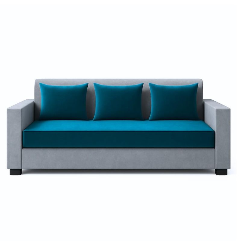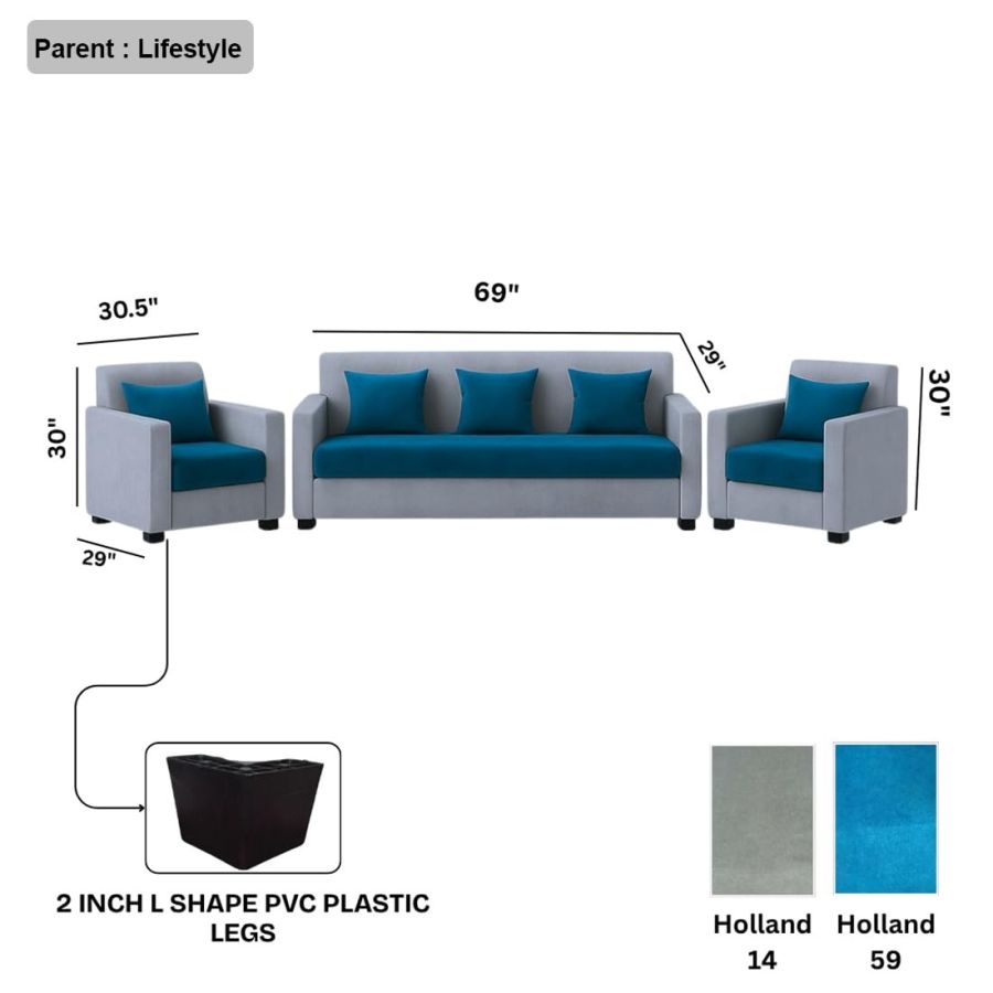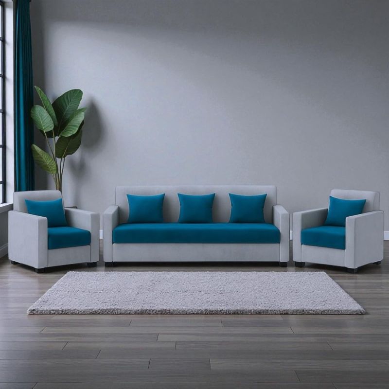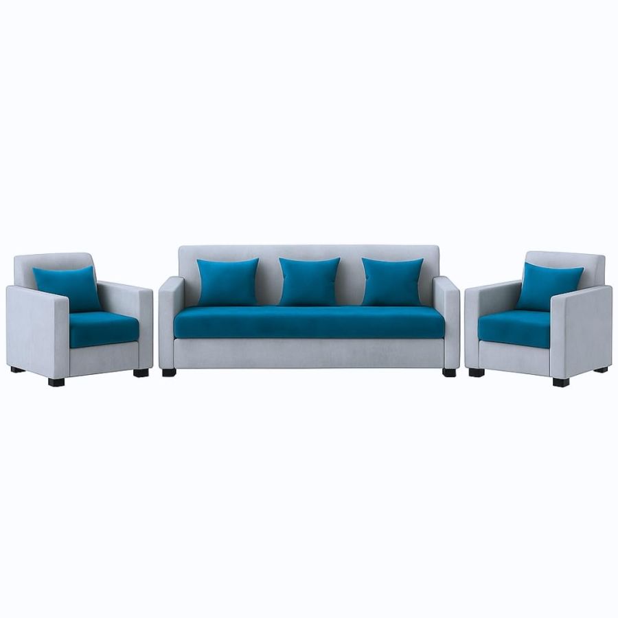 FURNY Lexon 5 Seater Fabric 3+1+1 Sofa Set (Aqua Blue-Light Grey) | Premium Velvet Finish | Durable & Comfortable | Ideal for Living Room