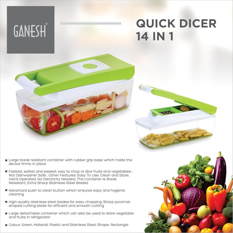 Fastest, safest and easiest way to chop or dice fruits and vegetables ; Not Dishwasher Safe ; Other Features: Easy To Use, Clean and Store, Hand Operated, No Electricity Needed, The Container Is Break Resistant, Extra Sharp Stainless Steel Blades