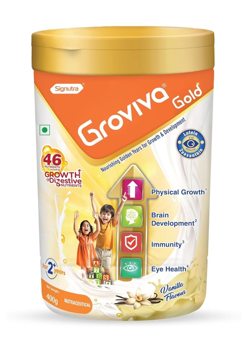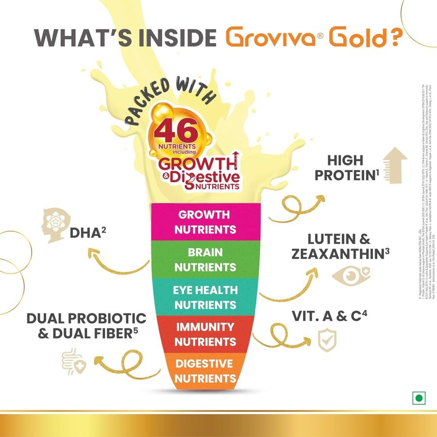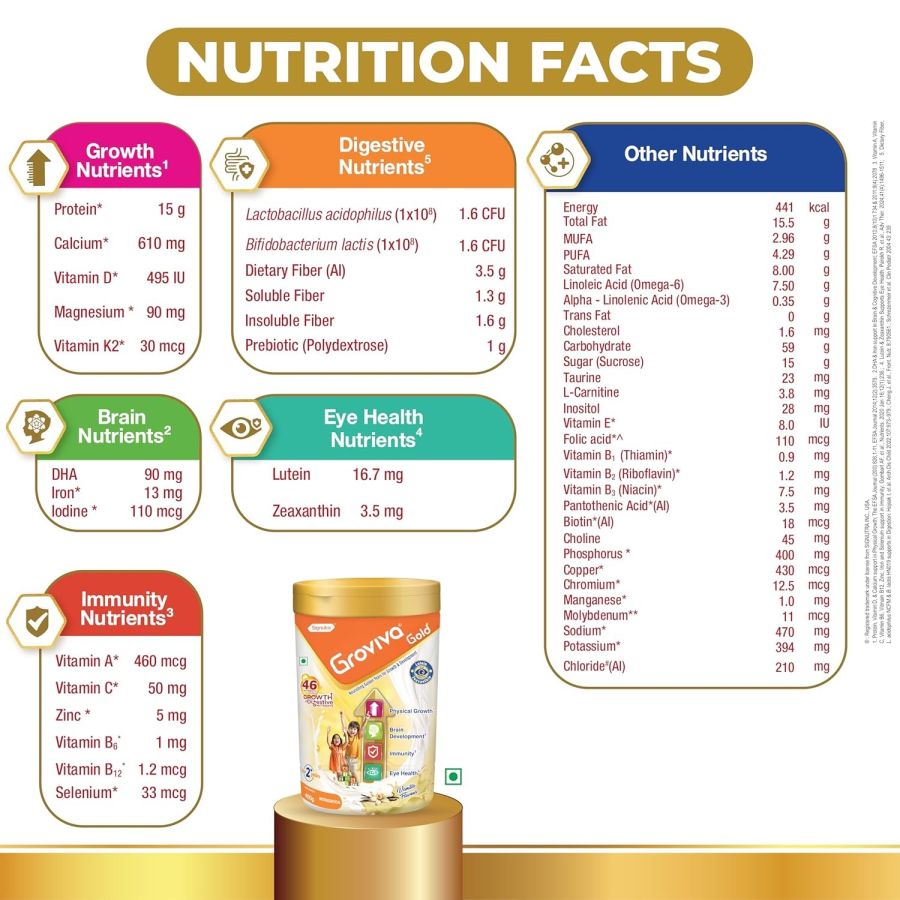 GROVIVA GOLD CONTAINS 46 VITAL NUTRIENTS & is power packed with the Unique combination of Growth & Digestive nutrients, which not only support Physical Growth but also helps in Brain Development, Immunity & addresses the critical issue of Eye Health in today’s growing children due to more screen time.