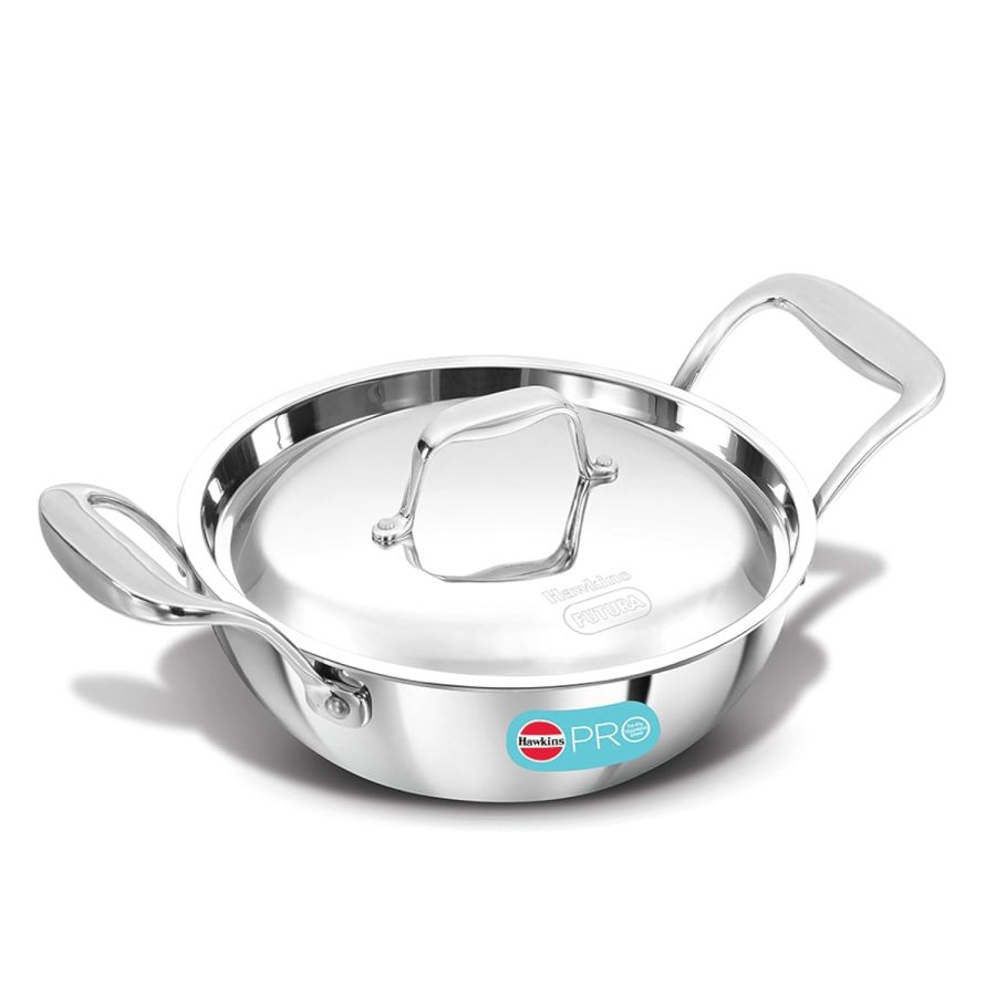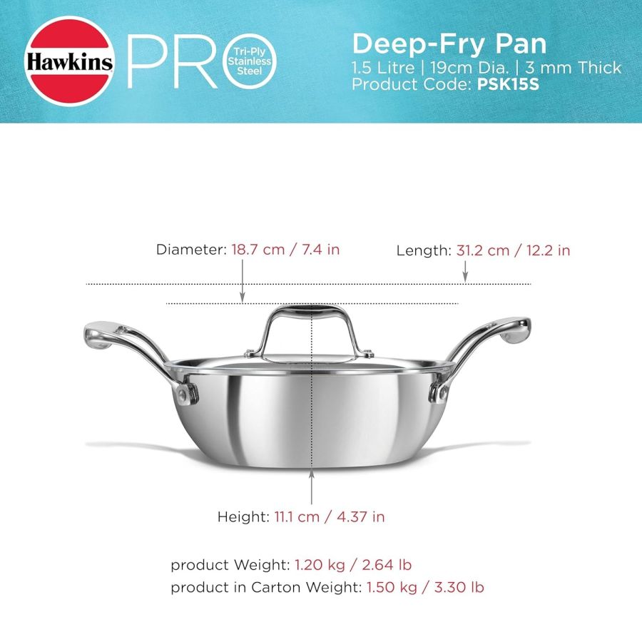 Hawkins Pro 1.5 Litre Deep-Fry Pan, Triply Stainless Steel Kadhai with Steel Handles and Steel Lid, Small Kadhai, Silver (PSK15S)