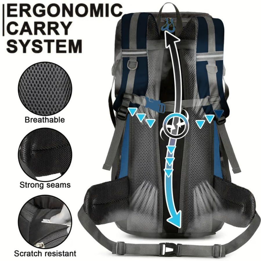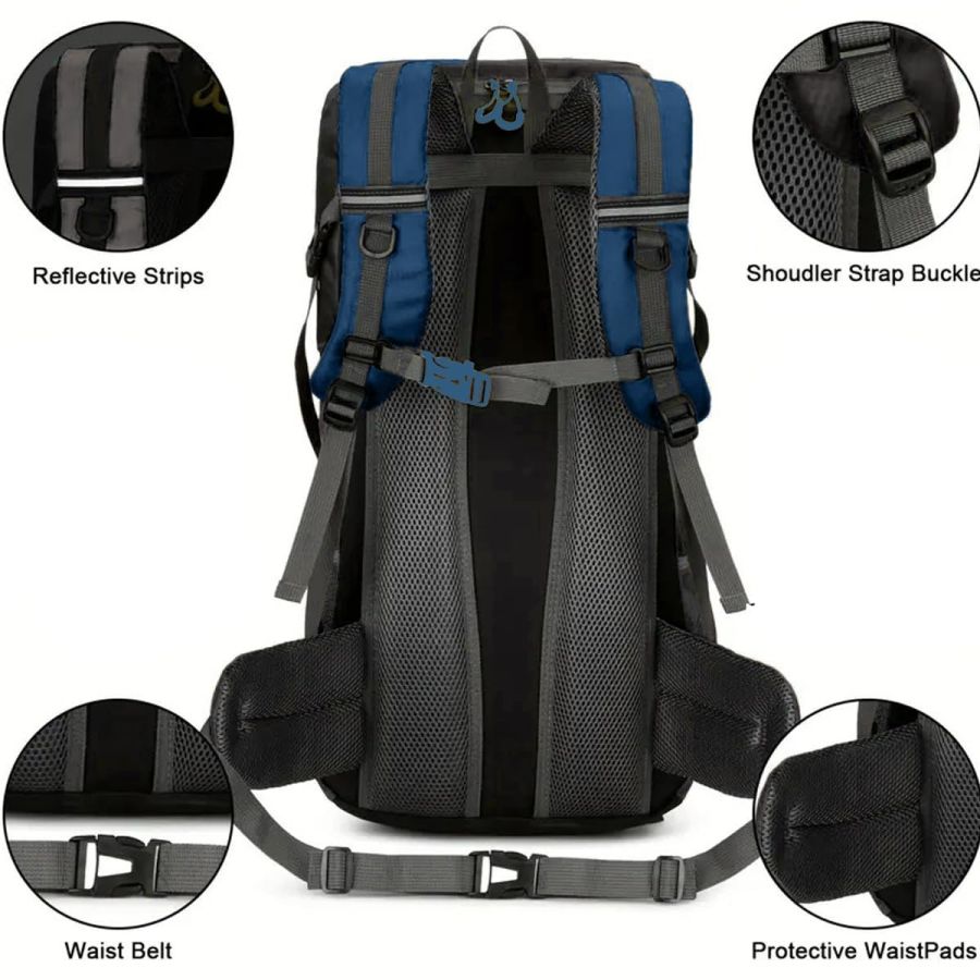 travel bags for men and women which is quite a big bag with a spacious main compartment and many large-capacity pouches. Rucksack bags 55 litres you can store tents, mats, sleeping bags, trekking poles, clothes, hiking shoes, umbrellas and cooking utensils and accessories. The backpack's internal mesh pocket compartment is easier to store and combine.
