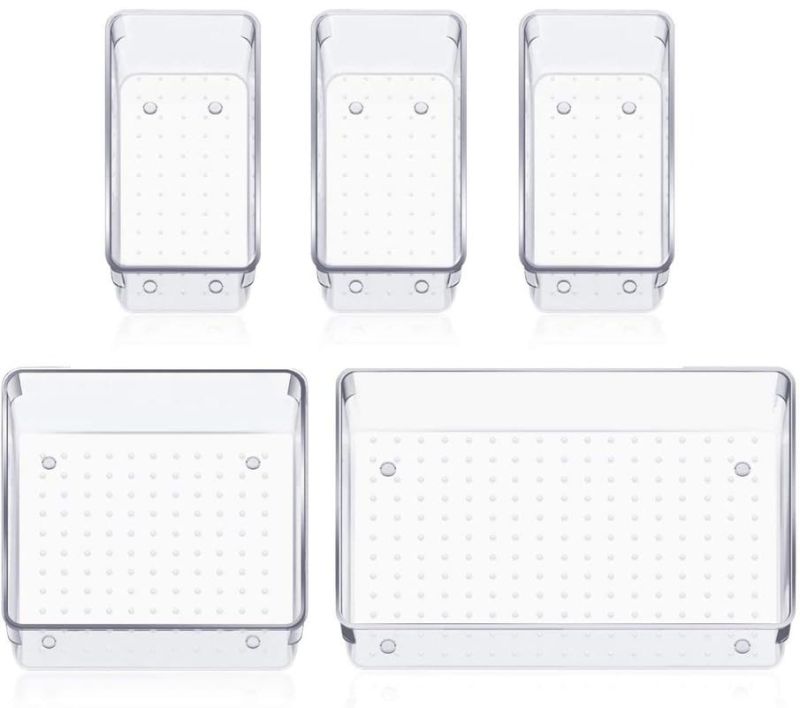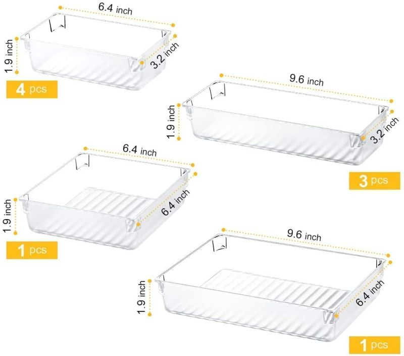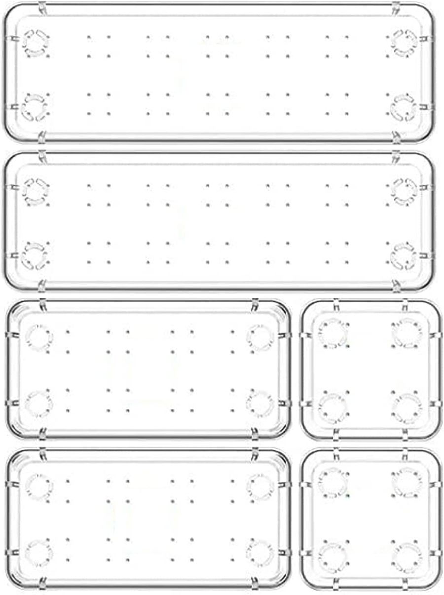 CUSTOMIZE LAYOUT AND HIGH QUALITY MATERIAL - 6 drawer trays in 3 different sizes allow you to customize the layout to fit any size drawer or specific need. Made of durable plastic, clear design can match almost any decor and make it easy to see your stuff and access what you want quickly, convenient for use.