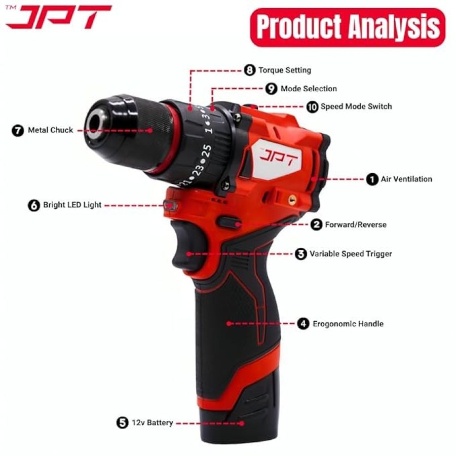 ????????+???? ???????????????????????? ???????????????????????????????? : This JPT 12v cordless drill machine has 23+3 torque settings that give you full control, helping to avoid over-tightening or damaging screws and surfaces. From beginners handling DIY projects at home to professionals on the job site, this drill machine is a versatile solution that combines raw power with advanced control for flawless results every time.