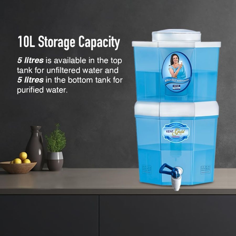 KENT Gold Optima Gravity Water Purifier | UF Technology Based | Non-Electric & Chemical Free | Counter Top | 5L Top + 5L Bottom Storage | White