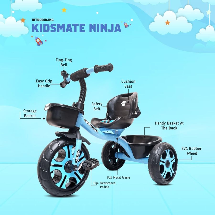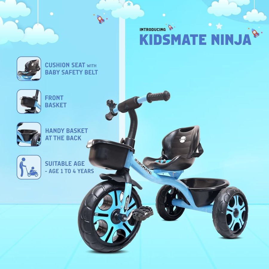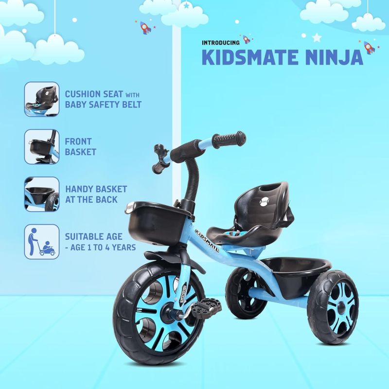 Kidsmate Ninja Plug N Play Durable Kids/Baby Tricycle, Storage Basket, Cushion Seat and Seat Belt for 12 Months to 48 Months Boys/Girls/Carrying Capacity Upto 30 Kgs (Blue)