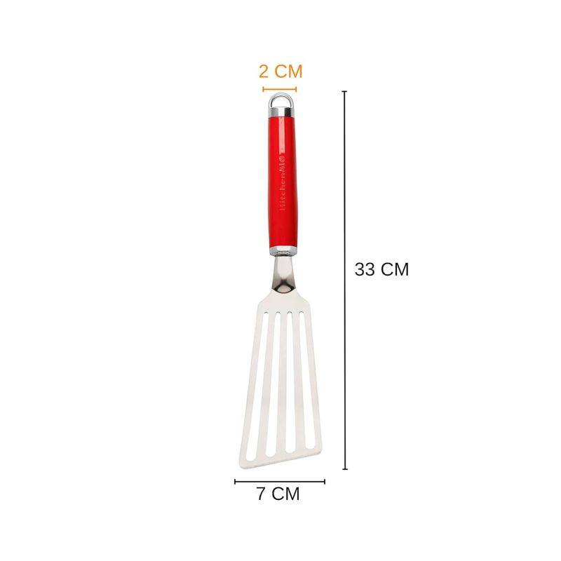 What You'll Get - KitchenAid Empire Red large Flex Turner, Stainless Steel Slotted Fish Slice, flexible head easily slides under delicate foods to lift, flip and serve