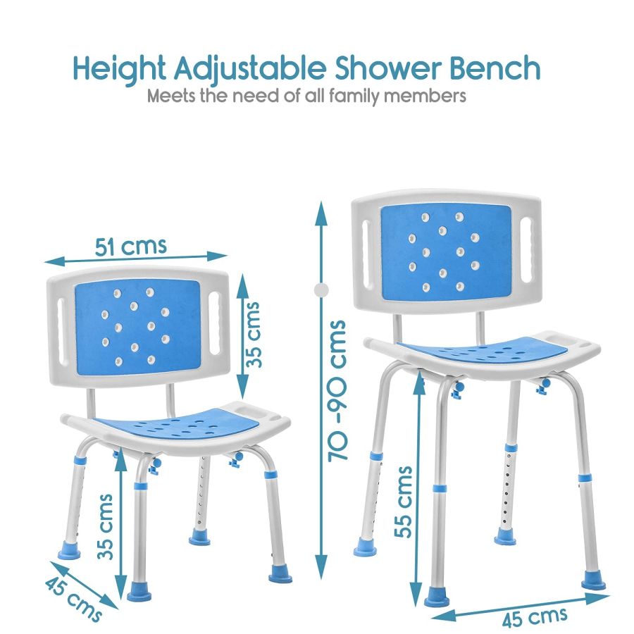 HEIGHT ADJUSTMENT: Easy adjustable shower bench for both children as well as adults. Adjustable Shower Chair with Convenient height adjustable push pins. Seat height is adjustable in 2.5 cms increments from 35 cms to 55 cms.