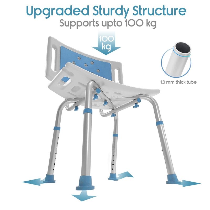 DURABLE AND LIGHTWEIGHT: This shower chair is made from lightweight materials with high tensile strength, which makes it sturdy & heavy duty. The aluminium frame provides a high load-bearing capability up to 100 kgs.