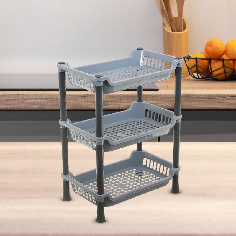 Kuber industries Plastic 3 Layer Multi-Purpose Kitchen Storage Basket Rack|Vegetable Basket For Kitchen (Grey Tiered Shelf)