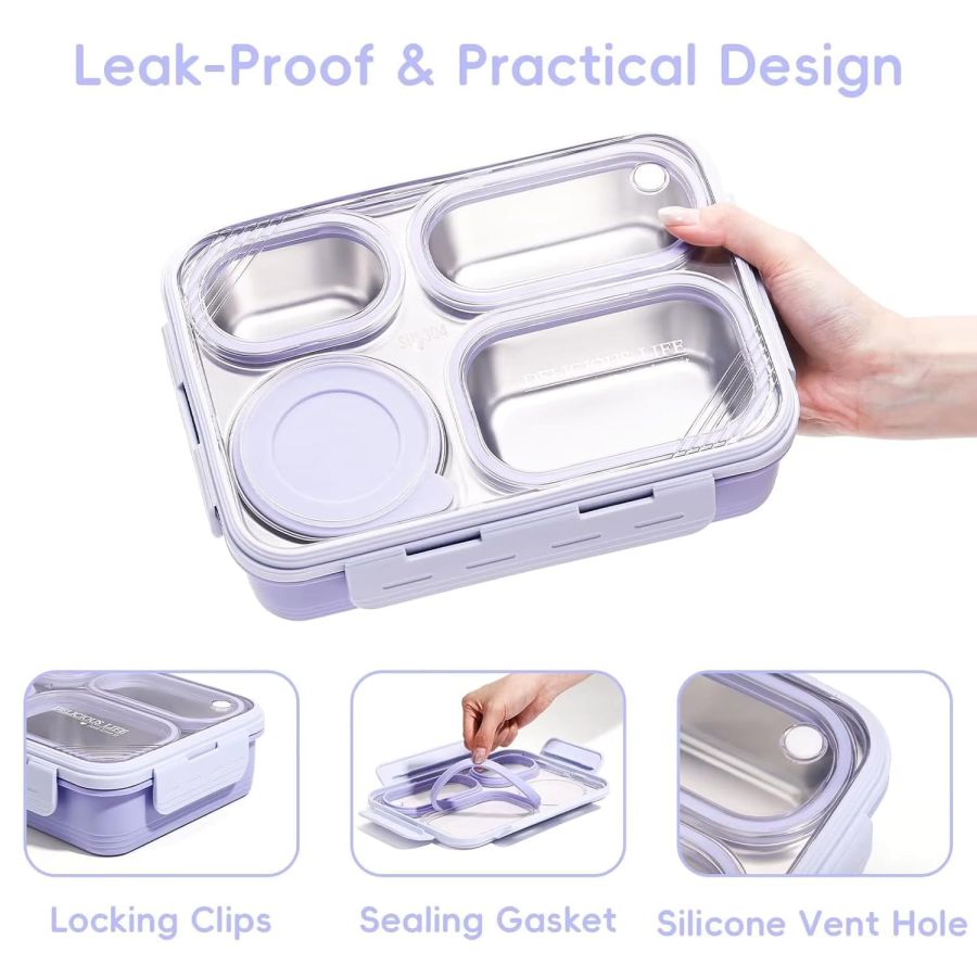 Four Compartment Leakproof Bento Lunch Box: The SYJBUH stainless steel lunch box for office use features four compartments for perfect portion control and mess-free meals great for school, picnic, or travel.