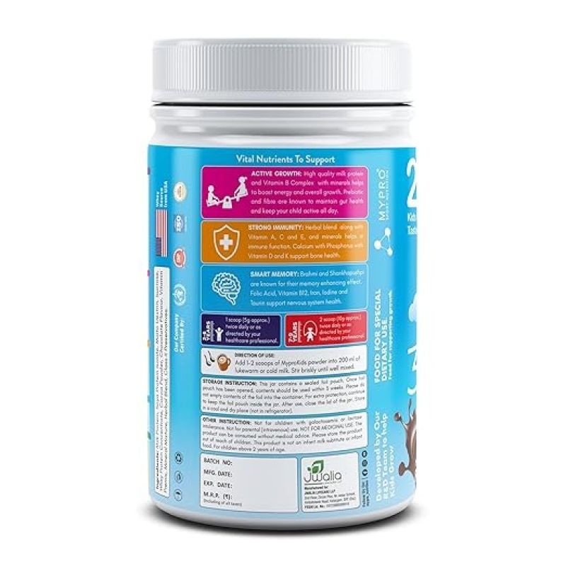 Serving suggestion - Add 1-2 Scoops of Myprokids Powder In 200 ml of lukewarm or coldmilk. Stir brisky until well mixed- For 2-6 Years - 1 scoop (5g approx) twice daily or as directed by your healthcare professional, and For 7-10 Years Baby:-2 Scoop (10g approx.) twice daily or as directed by your healthcare professional.