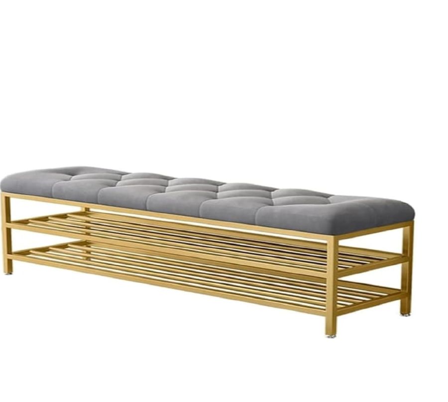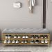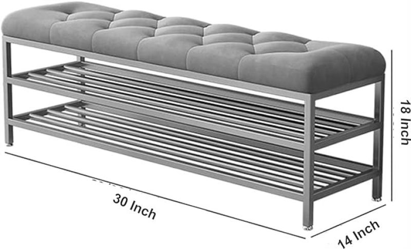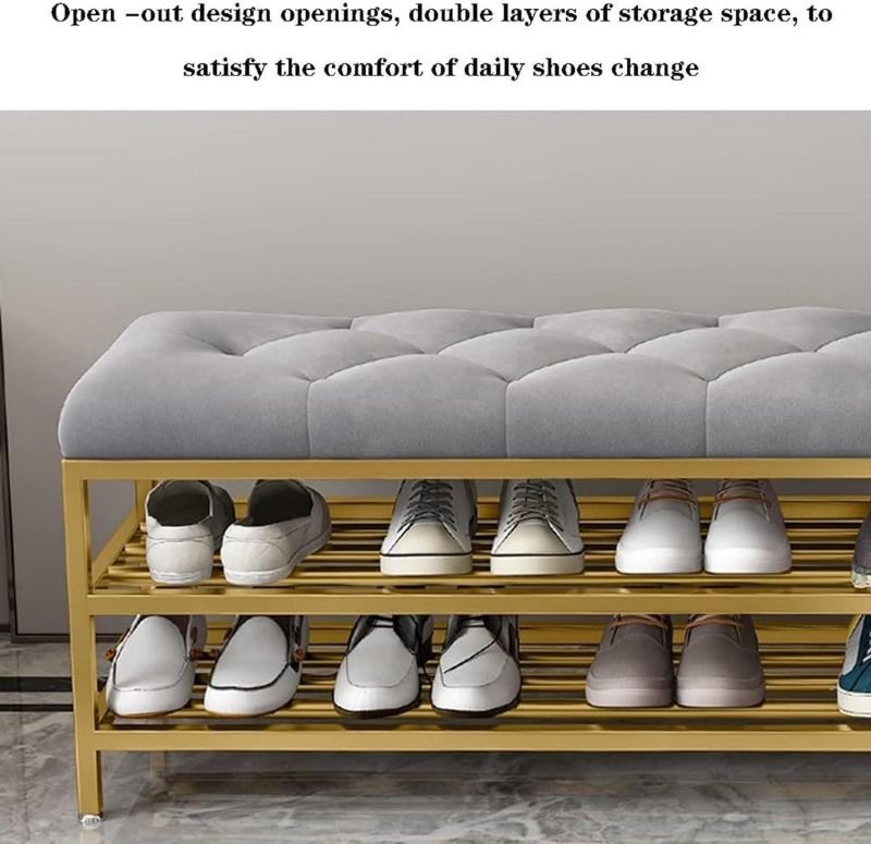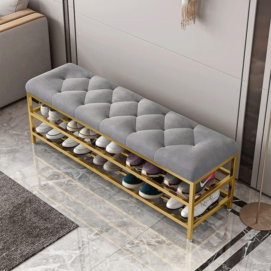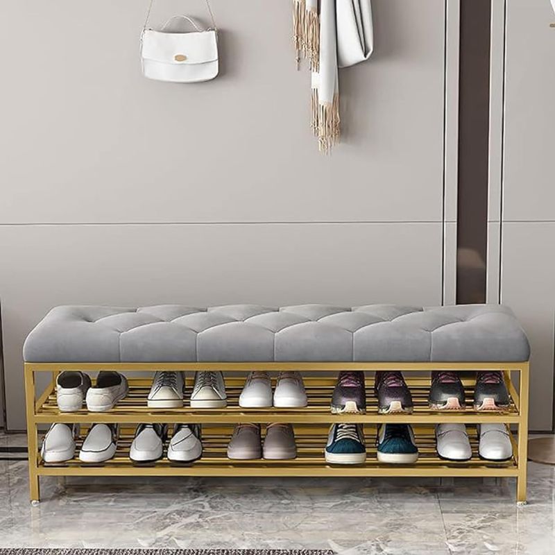 Padded Ottoman Bench Velvet Cushioned with Metal Frame Iron Shoe Rack Space-Saving for Bedroom Entryway Hallway