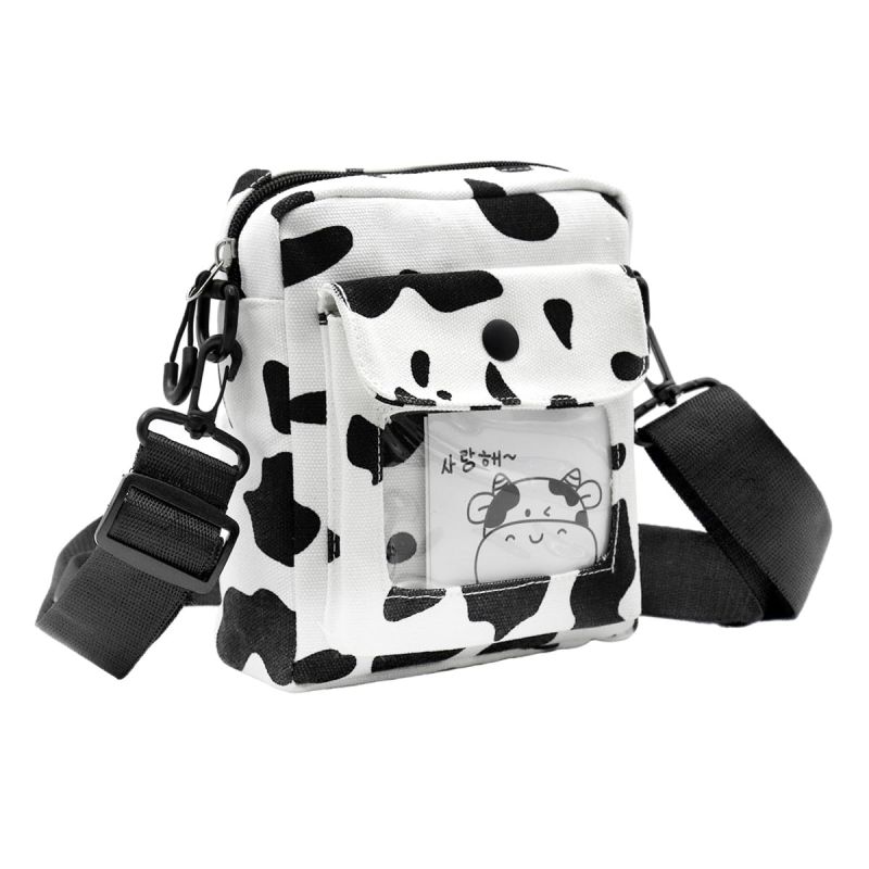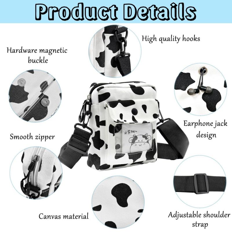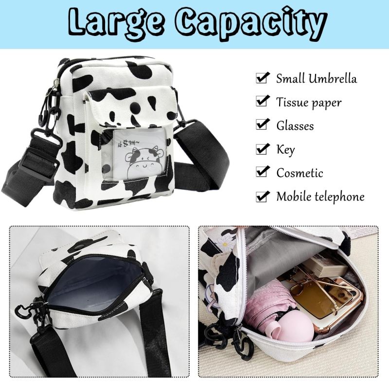 - FASHION COW PRINT CANVAS CROSSBODY BAG: Sized at 15x18cm, this canvas crossbody bag blends functionality with style. Adorned with a playful cow print, this bag exudes a classic while cute charm, offering a convenient and stylish solution to carry small-sized items such as a phone, power bank, or wallet. The inclusion of a transparent window pocket alongside a secure zipper pouch makes it a cute and versatile accessory for everyday use.