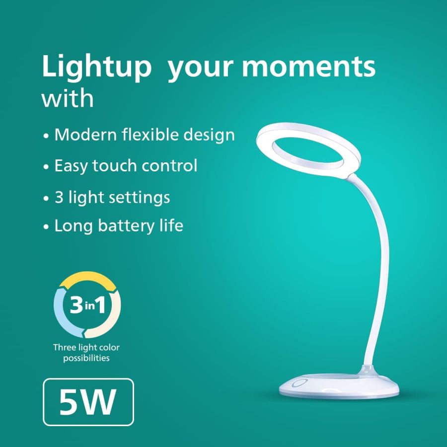 Philips Polycarbonate Orbit 5W Led Table Lamp|3 in 1 Colour Changing Rechargeable Desklight with Brightness Control,White