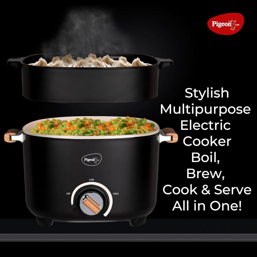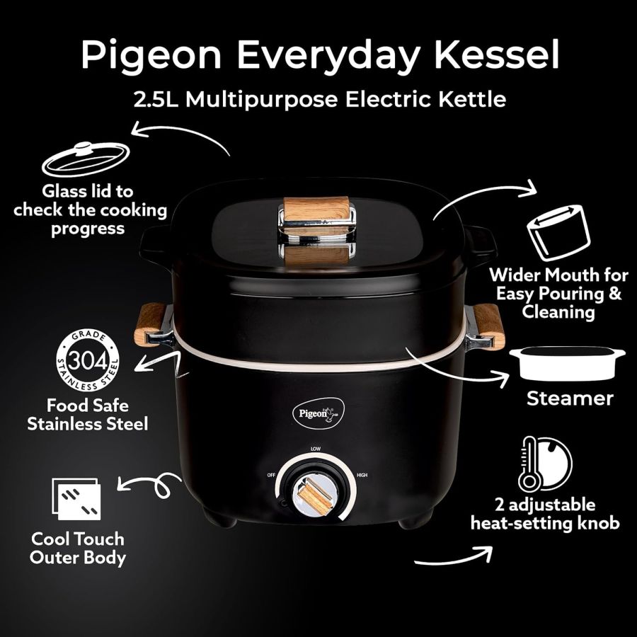 Pigeon Stainless Steel By Stovekraft Everyday Plus Multi-Cook Kettle,1000 Watts,2.5 Litre, Used For Boil, Brew, Cook & Serve All In One (Black)