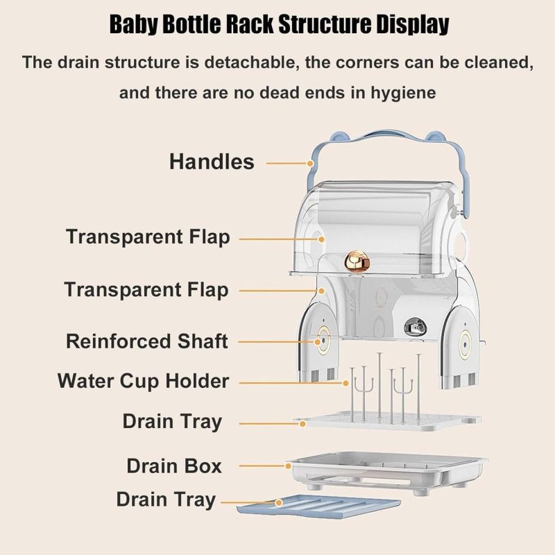 Practical Design: This baby bottle rack features a transparent airtight lid, and a built-in drawer drainer, allowing you to effectively dry, store and organize baby bottles and accessories. The whole body can be disassembled freely for more thorough cleaning. Dishwasher safe.