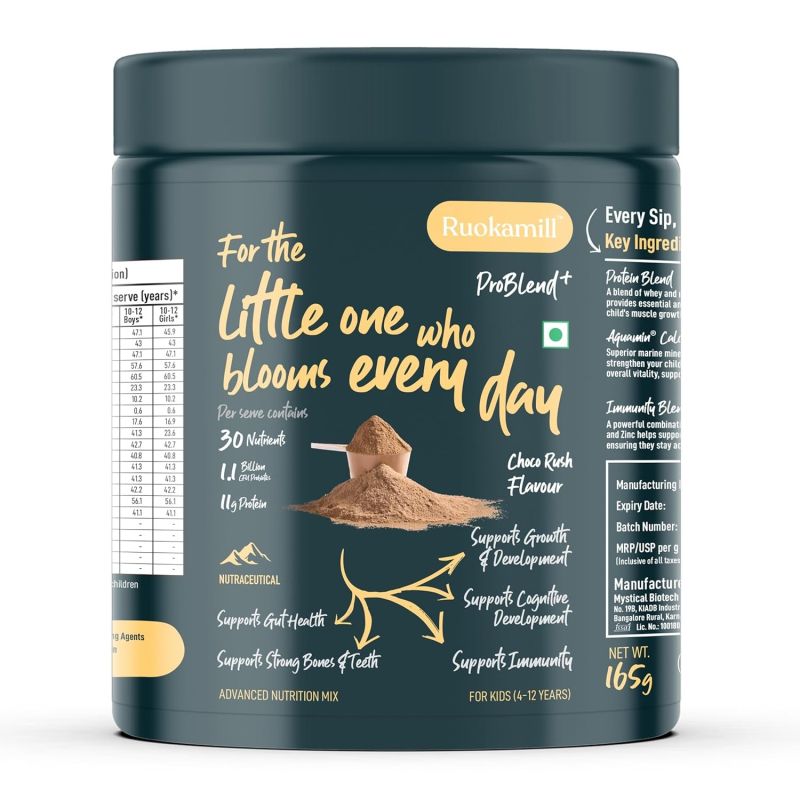 INTRODUCING: Ruokamill ProBlend⁺ for kids is a daily nutrition mix crafted for growing kids (4–12 yrs). With 11g protein, Omega-3s (EPA & DHA), and HOWARU Protect Kids probiotics, it supports muscle growth, brain function, gut health, and immunity. Naturally sweetened with dates and coconut jaggery, no refined sugar. Enriched with 30+ nutrients including Aquamin calcium, Vitamin C, D3, and iron. Tasty Choco Rush flavour kids enjoy!