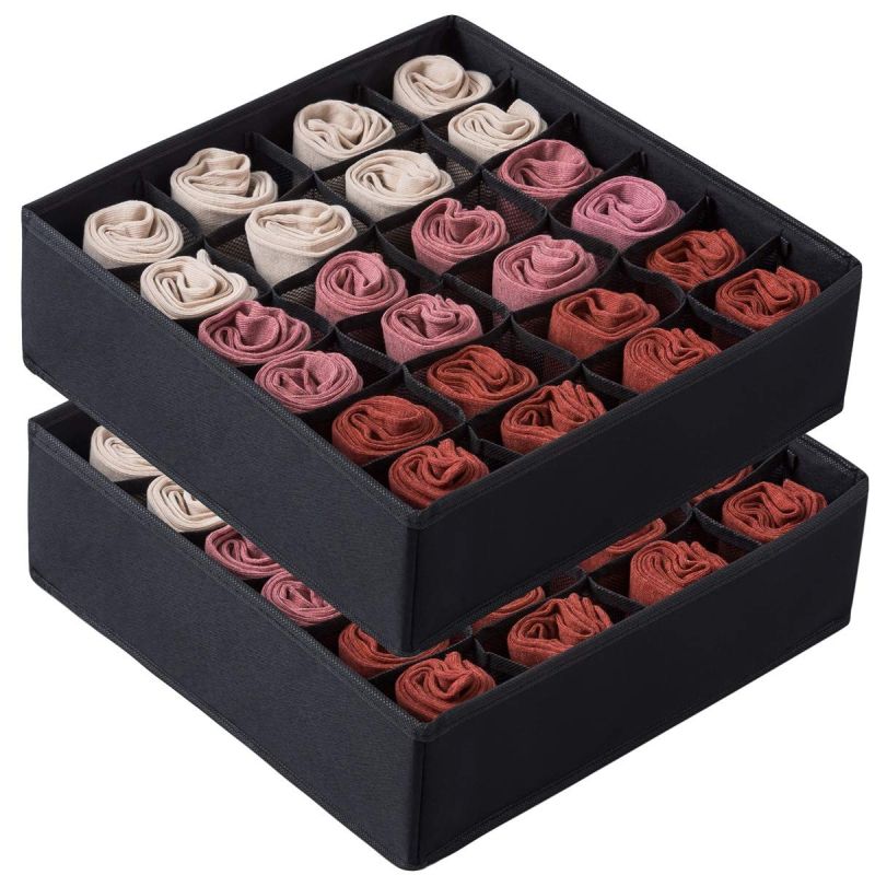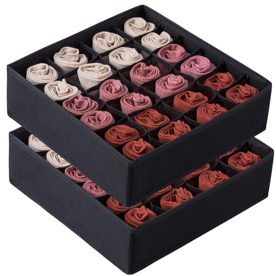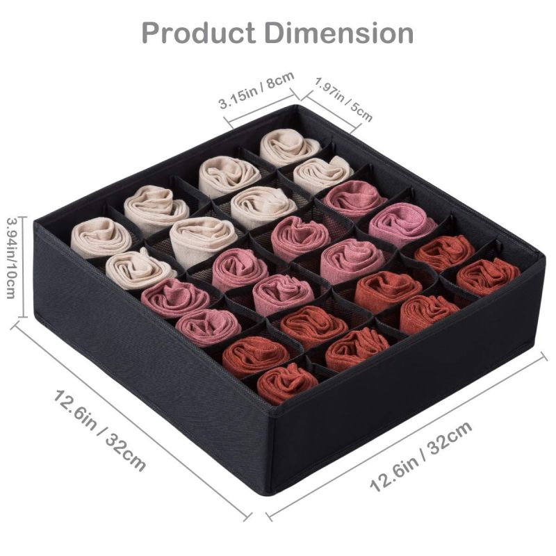 GREAT SOCK ORGANIZER: The package contains two 24-cell sock organizers, each compartment measuring about 2.1x3.15x3.54 in, perfect for storing your crew socks, thin socks, panties, etc.