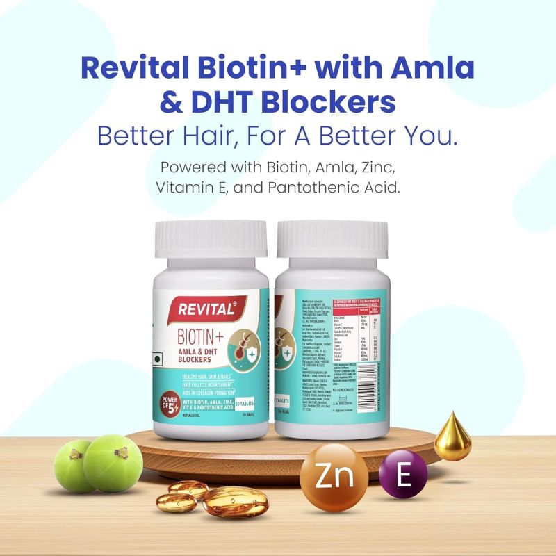 Revital Biotin+ with Amla and DHT Blockers for Hair Growth | Biotin, Amla, Zinc, Vitamin E & Pantothenic Acid | Supports Hair Strength & Skin Health | 50 tablets
