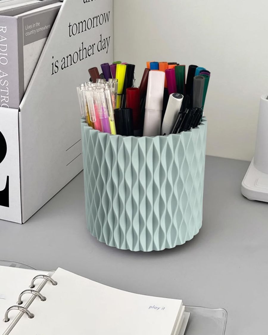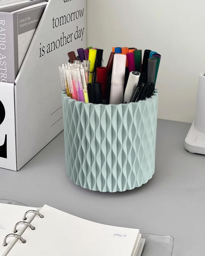 ROTATING PEN PENCIL HOLDER FOR DESK - A brand new unique design with water ripple pattern, 5 slots and smooth rotating base for pen holder desk organizer. Its simple and neutral design makes it easy to fit in with just about any decor for your home vanity school office desk art supply accessories. Ideal gift for birthday, christmas day, anniversary, etc.