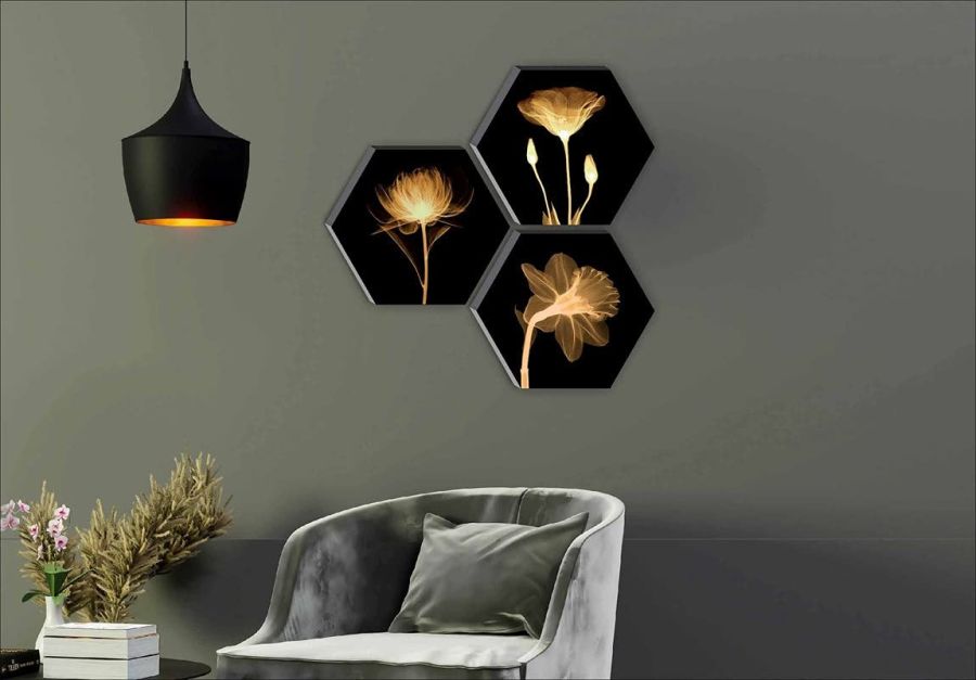 SAF Set of 3 Hexagon Preety Brown Floral UV Textured MDF Home Decorative Gift Item Painting 17 Inch X 17 Inch SANFHX15SMALL