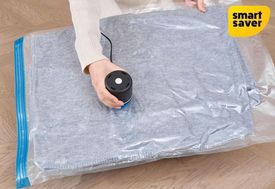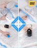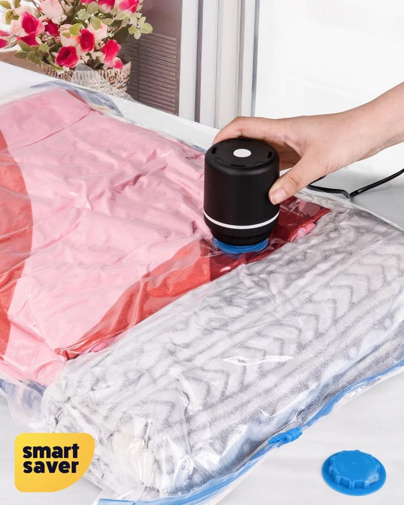 Using electric air pump to vacuum the air out of the vacuum bags is high efficient and easier. You don't need to use your strength to pull and push the hand pump again and again to take the air out of the vacuum storage bags. After packing the bags, you just need to is wait the electric pump to take all of the air out of the bag. In generally, it takes about 50 seconds to finish vacuuming one Jumbo vacuum storage bag.