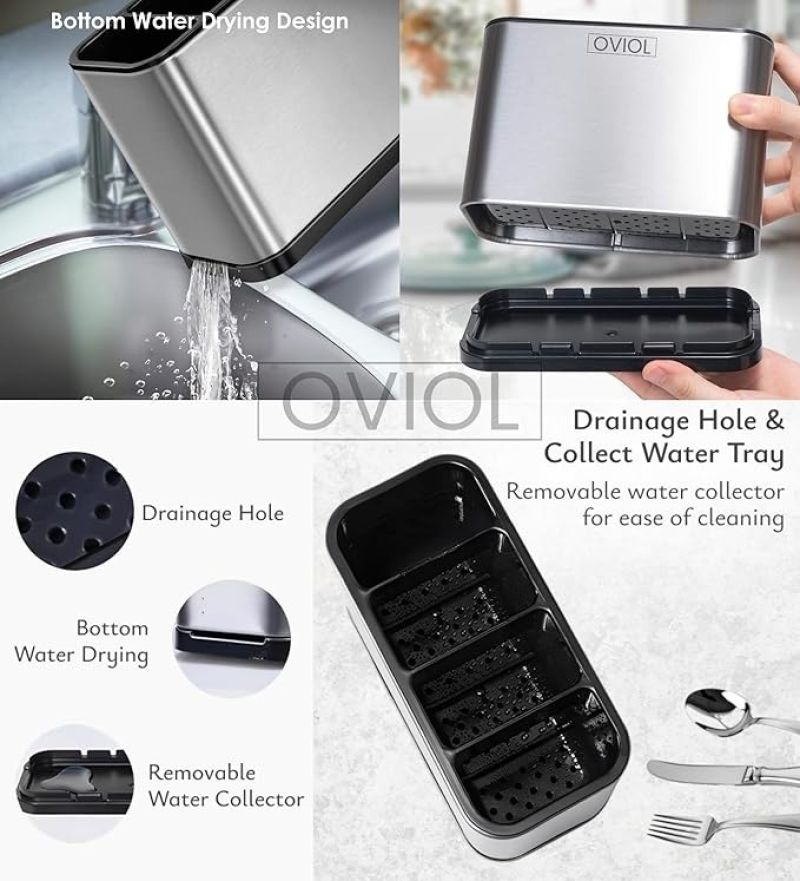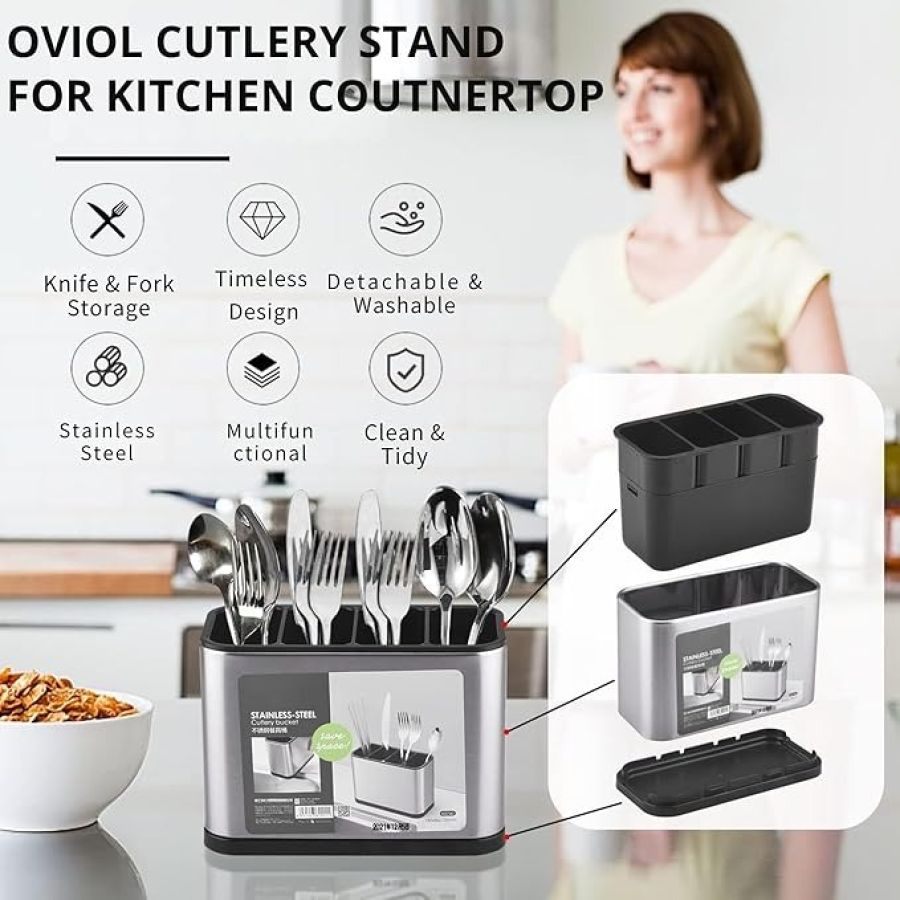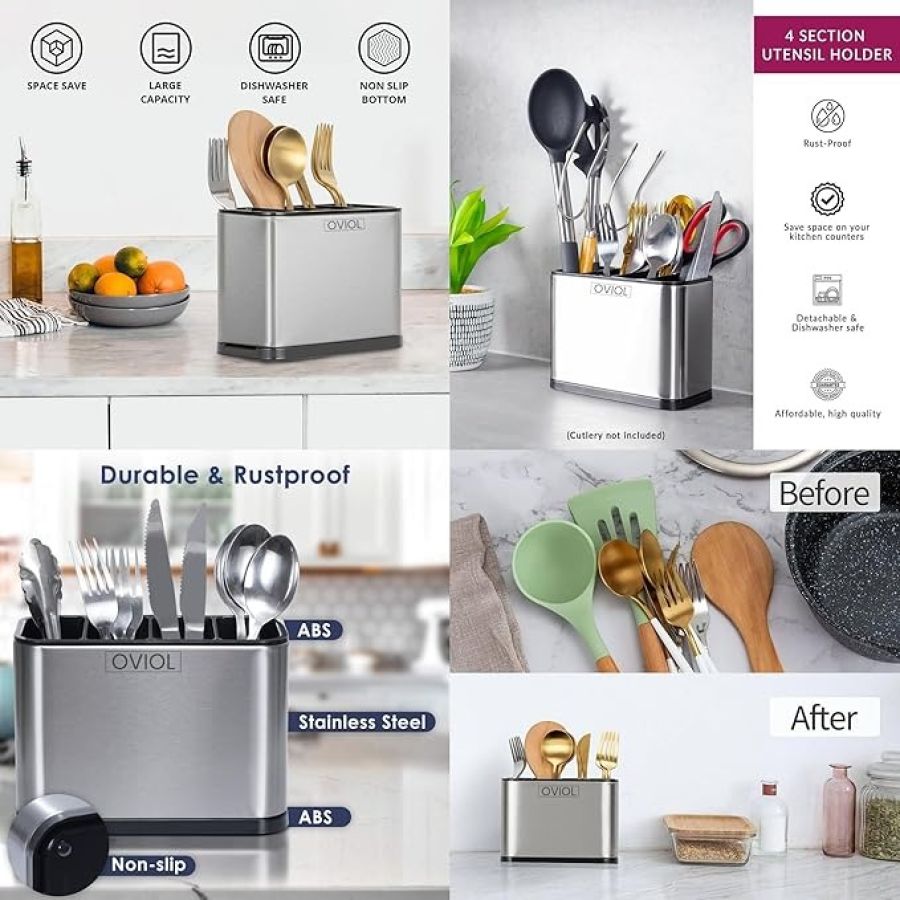 Large Capacity & Versatile Storage Featuring four spacious compartments, this spoon stand accommodates spoons, forks, knives, spatulas, and more. With this cutlery holder for kitchen counter top, you can store all your kitchen tools in an organized and easily accessible way.