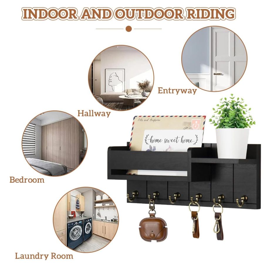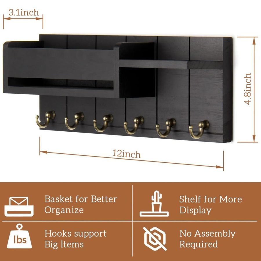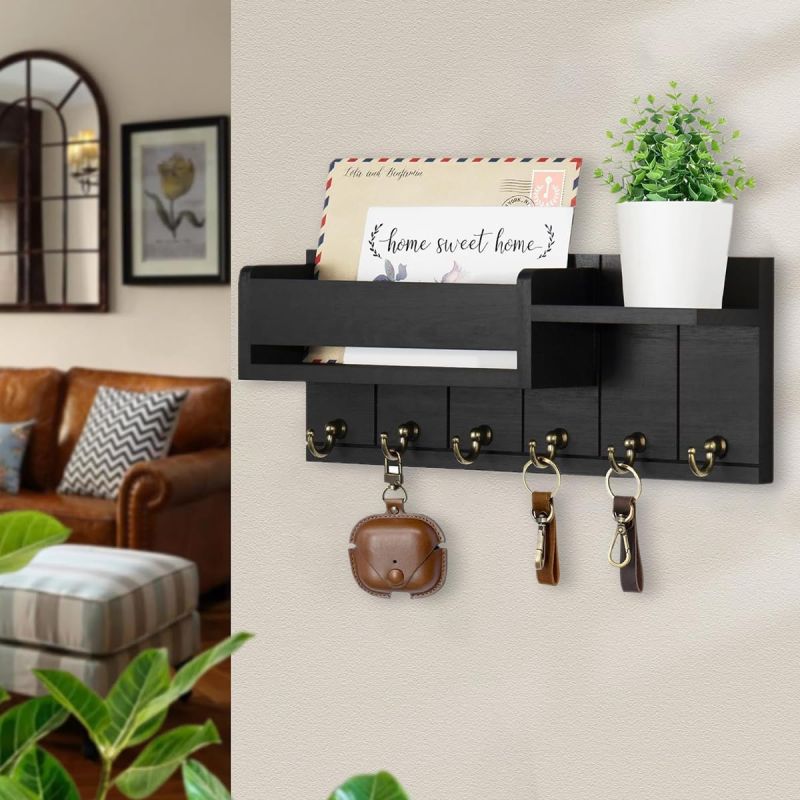 SIX GOLDEN METAL HOOKS: Never misplace your keys again! This versatile keychain holder and key holder stand features six high-quality golden metal hooks that can hold your keys, lanyards, hats, or small bags. Each sturdy hook on this wooden key holder for home offers reliable organization while enhancing your home decor with a stylish metallic contrast to the matte black wood finish a truly key holder for home decor stylish addition
