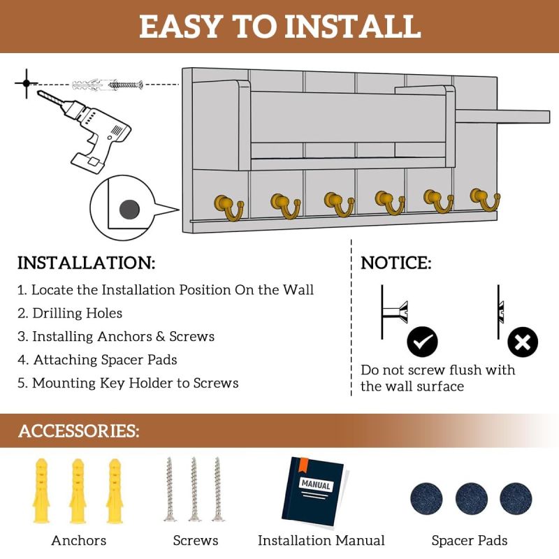 EASY INSTALLATION: Setting up your key holder stand is effortless. This wooden key holder for home includes a convenient screw pack, ensuring a secure wall mount. Even first-time users can install this keychain holder quickly, creating an instant key organiser corner that transforms your everyday routine