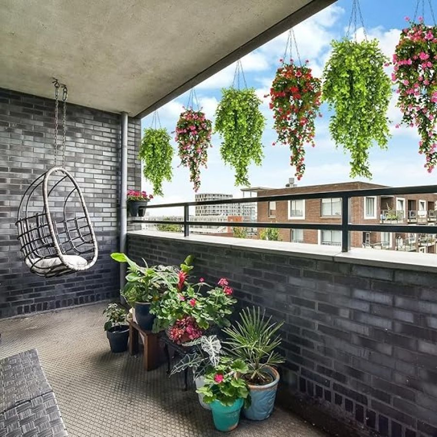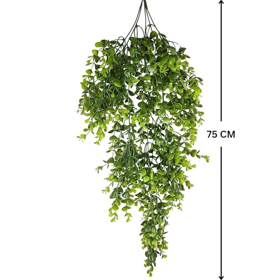 Quantity and measurements: Each artificial hanging plant has 5 branches; the length of the fake plant is 75 cm or 2.5 ft and width is around 25 cm. Each hanging plant contains dense leaves. Greenery leaves are around 8 – 9 cm in length.