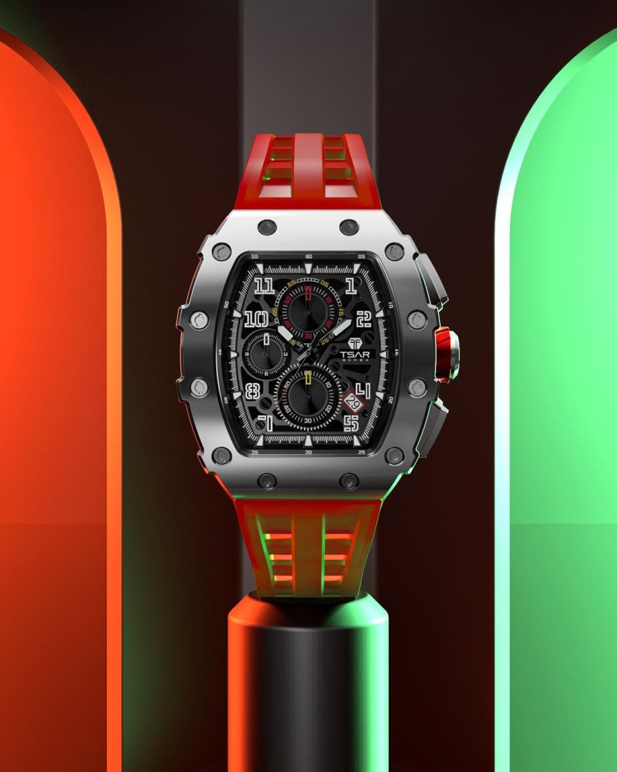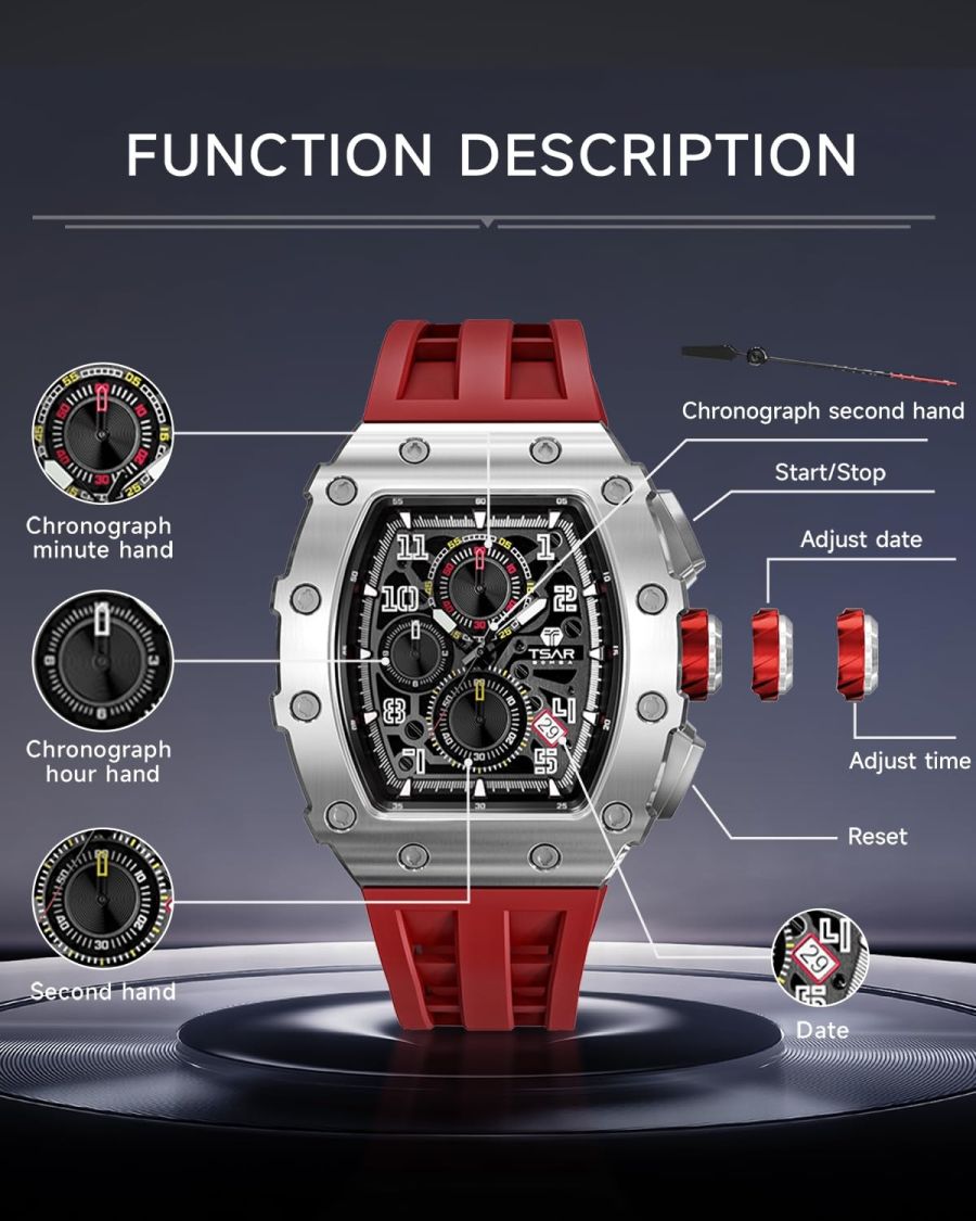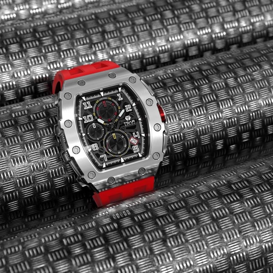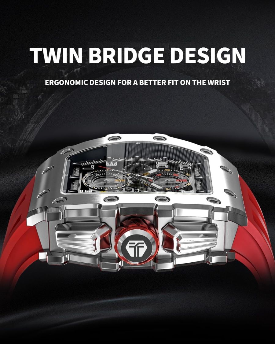 ????【 ERGONOMIC DOUBLE BRIDGE DESIGN】TSAR BOMBA watch was born in the Sino-German Force Lab. Based on mechanical mechanics, innovative materials, and precision manufacturing, it integrates oriental aesthetics and strives to make continuous breakthroughs in tech. Adopts an ergonomic double bridge design. Each case has undergone 202 processes to make the watch more fit the human wrist, greatly enhance the matching experience.A visual feast of simple luxury that brings out the best of men's style.