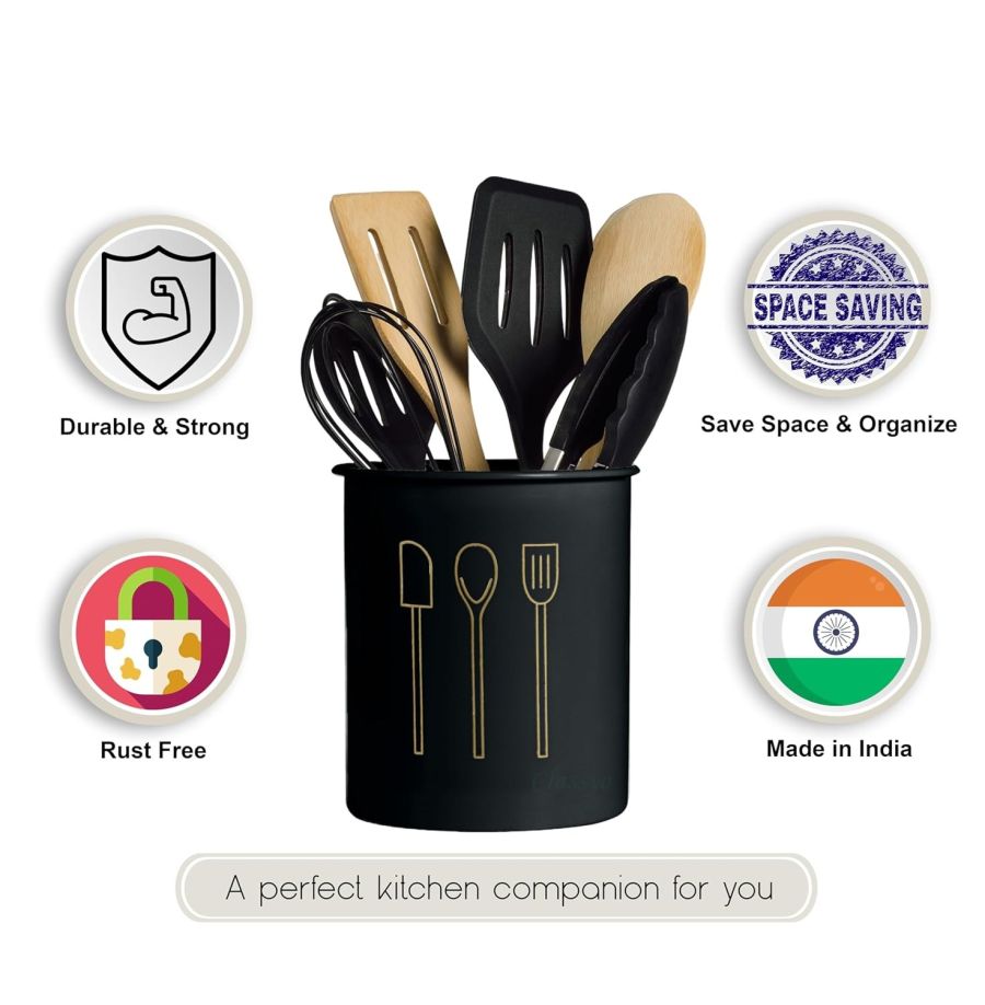 Durable ladle holder. Made of tough steel and is then finished for a premium look. The presence of the cutlery stand enhances the beauty of your kitchen.