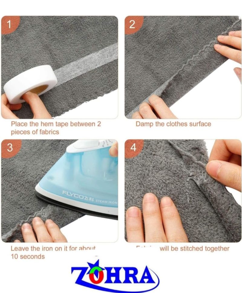 ZOHRA Easy to apply: flat the clothes, cut a piece tape and place it in the seam, damp the clothes surface, then leave the iron on it for about 10 seconds moving iron back and forth