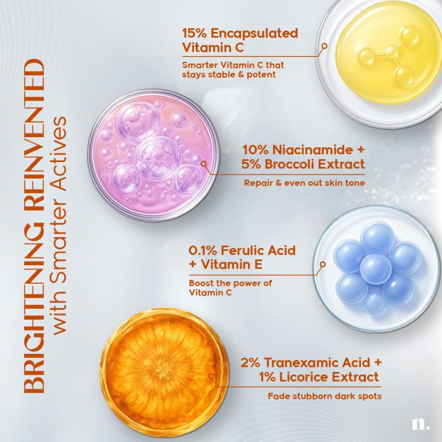 Brightening & Antioxidant Serum –This vitamin c serum for glowing skin is powered with 15% Encapsulated Vitamin C for improved delivery, along with Niacinamide, Tranexamic, Ferulic, and Vitamin E to support skin radiance, and Licorice Extract, Panthenol, and Broccoli Extract to nourish and help maintain skin’s natural barrier.