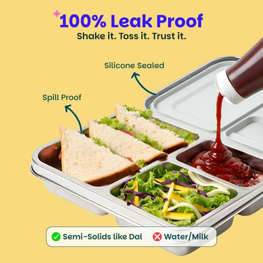 Leakproof lunch box for kids: Our innovative leakproof lunch box features an advanced silicone seal with a unique step function design, ensuring your child's food stays securely separated in their respective compartments. While perfect for containing wet foods like dips, sauces, and yogurts, it's not recommended for runny liquids or water.